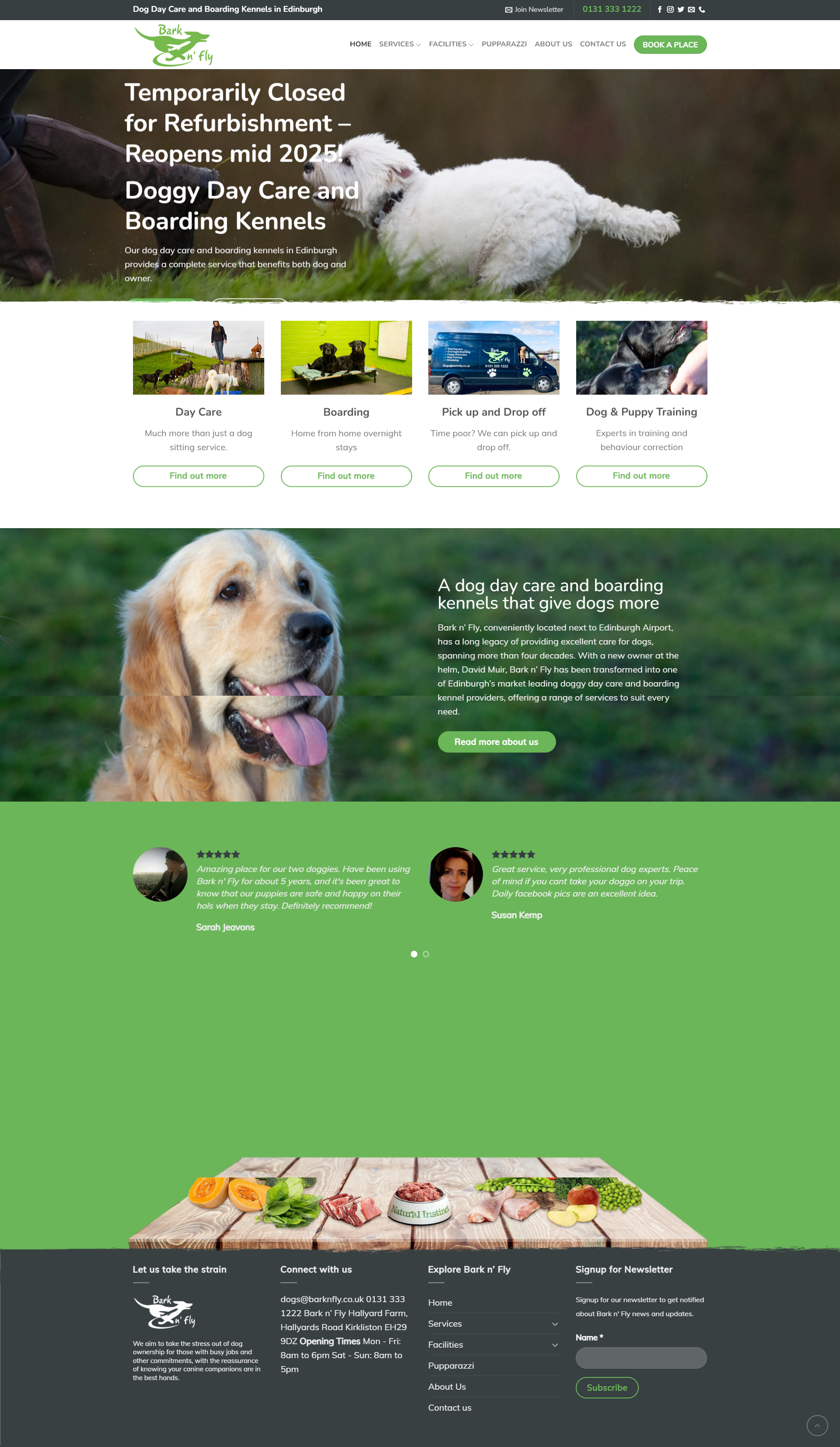 Established over four decades ago, Bark n’ Fly has a long history and legacy of providing excellent day care facilities and boarding kennels for dogs and their owners in Edinburgh. Bark n’ fly is now under the ownership of dog lover and experienced gun dog trainer and handler, David Muir. Together with his dedicated and passionate team, David has worked hard since taking over the business in March 2017 to transform Bark n’ Fly into the market leading business that it is today, offering dogs from all over the country an experience to remember.