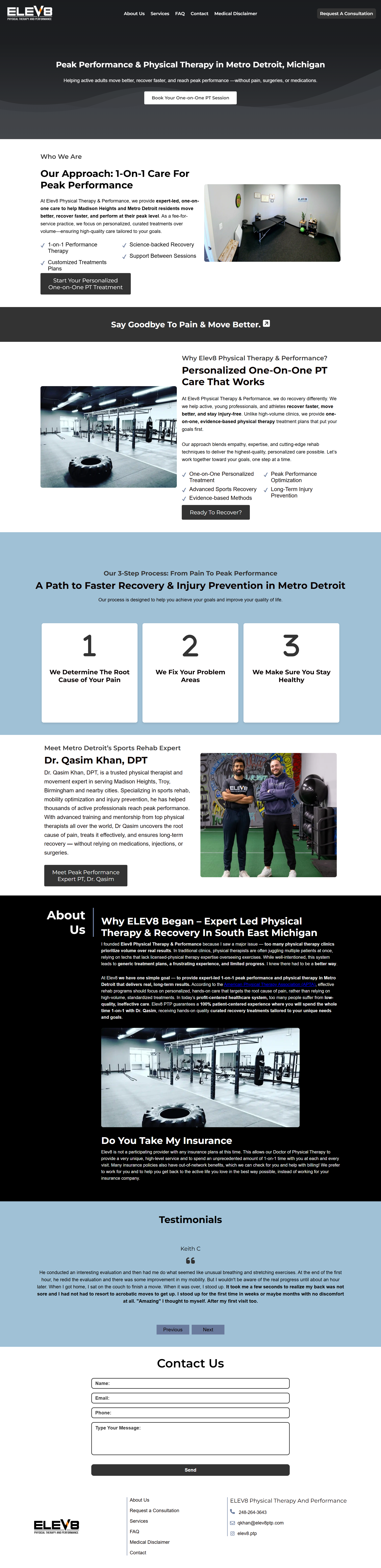 At Elev8 Physical Therapy & Performance, we provide expert-led, one-on-one care to help Madison Heights and Metro Detroit residents move better, recover faster, and perform at their peak level. As a fee-for-service practice, we focus on personalized, curated treatments over volume—ensuring high-quality care tailored to your goals.