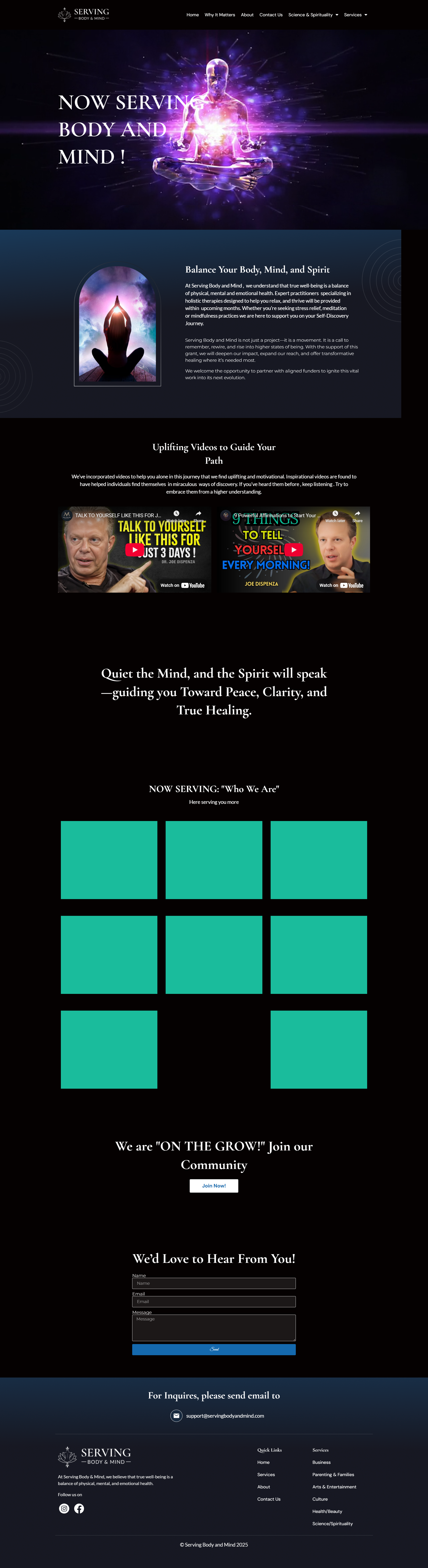 Serving Body and Mind is a visionary initiative designed to empower individuals through an integrative approach that blends conscious awareness, neuroscience, epigenetics, quantum physics, and neuroplasticity. This project seeks to bring life-changing education, healing practices, and experiential learning to communities—especially those that are underserved or disconnected from holistic wellness.