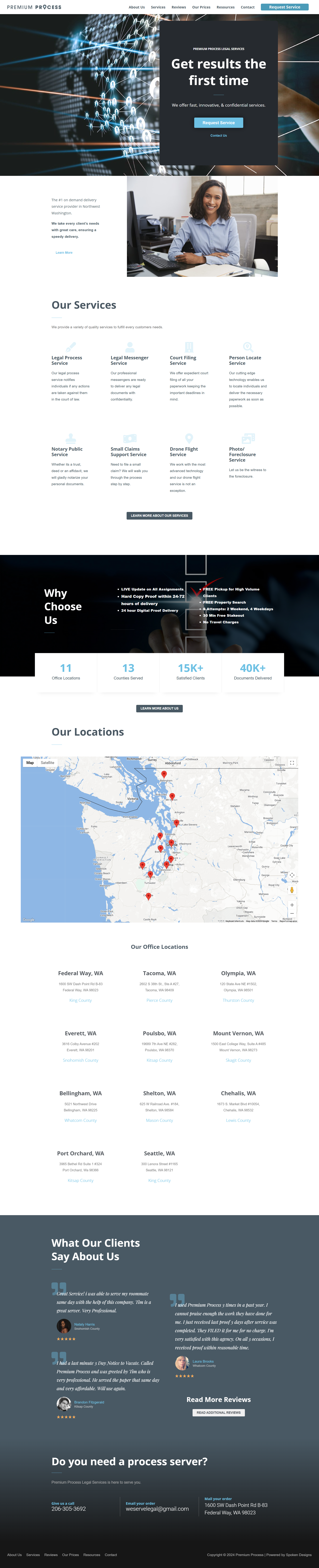 Premium Process is a legal service of process company that provides variety of legal and investigative work in the entire State of Washington. We offer courthouse services that includes filing of cases, retrieving old documents, skip tracing, legal process service, messenger services, person locate services and other related work. We built long term relationships with many attorneys and law firms and take pride in their completed satisfaction. Our staff is ready to meet any strict deadlines and special arrangements given to us to get the job done.